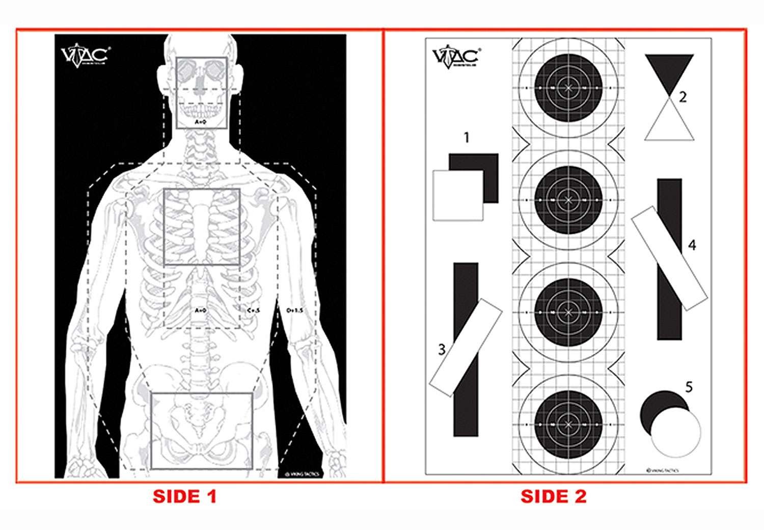 The VTAC double sided paper marksmanship/silhouette target offers versatility of 2 different targets on 1 sheet. Printed on extra heavy paper. Features a silhouette with visible skeleton and a marksmanship side that features 40 SR-1C bull’s-eye targets w/ 1″ square sighting grid.