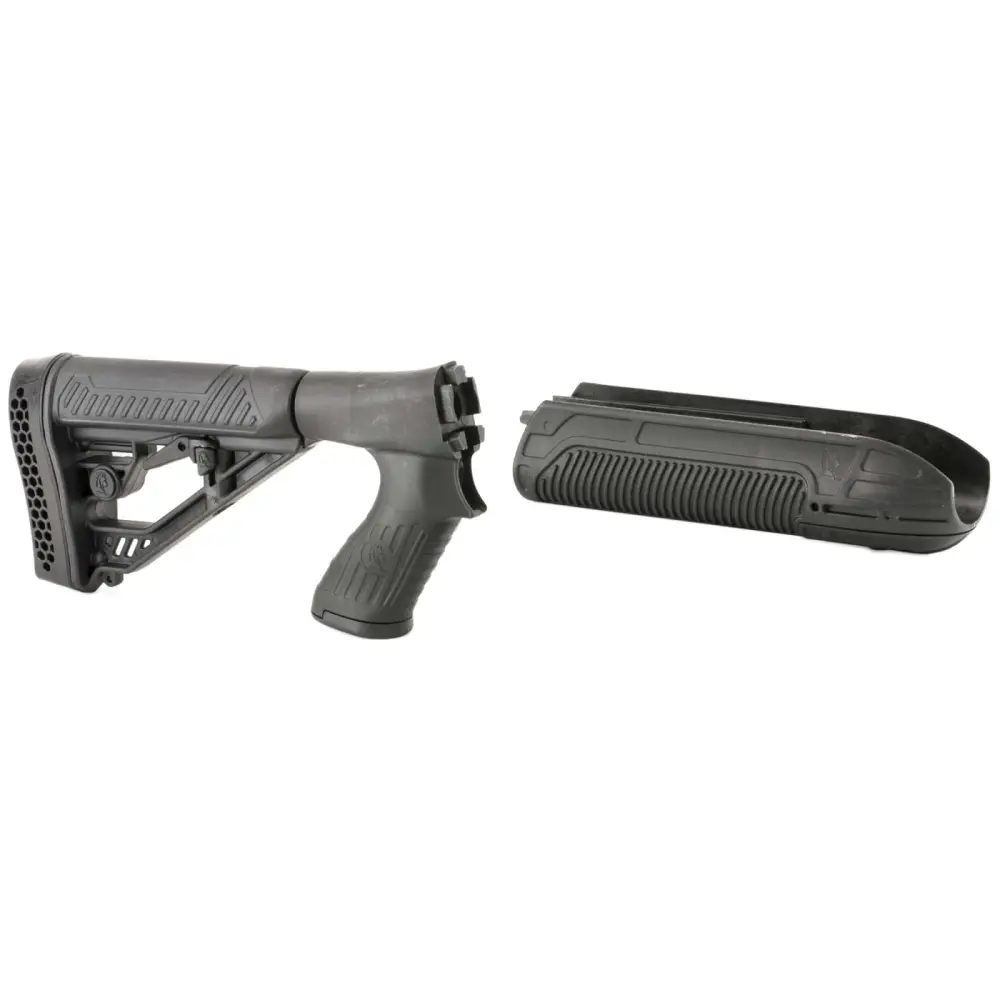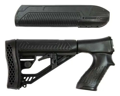 The M4-style rear stock with pistol grip has an adjustable length-of-pull, oversized extra strength adjustment pin, and a non-slip vented rubber recoil pad. The forend features a 2″ Picatinny rail concealed under nose cap for attaching accessories.