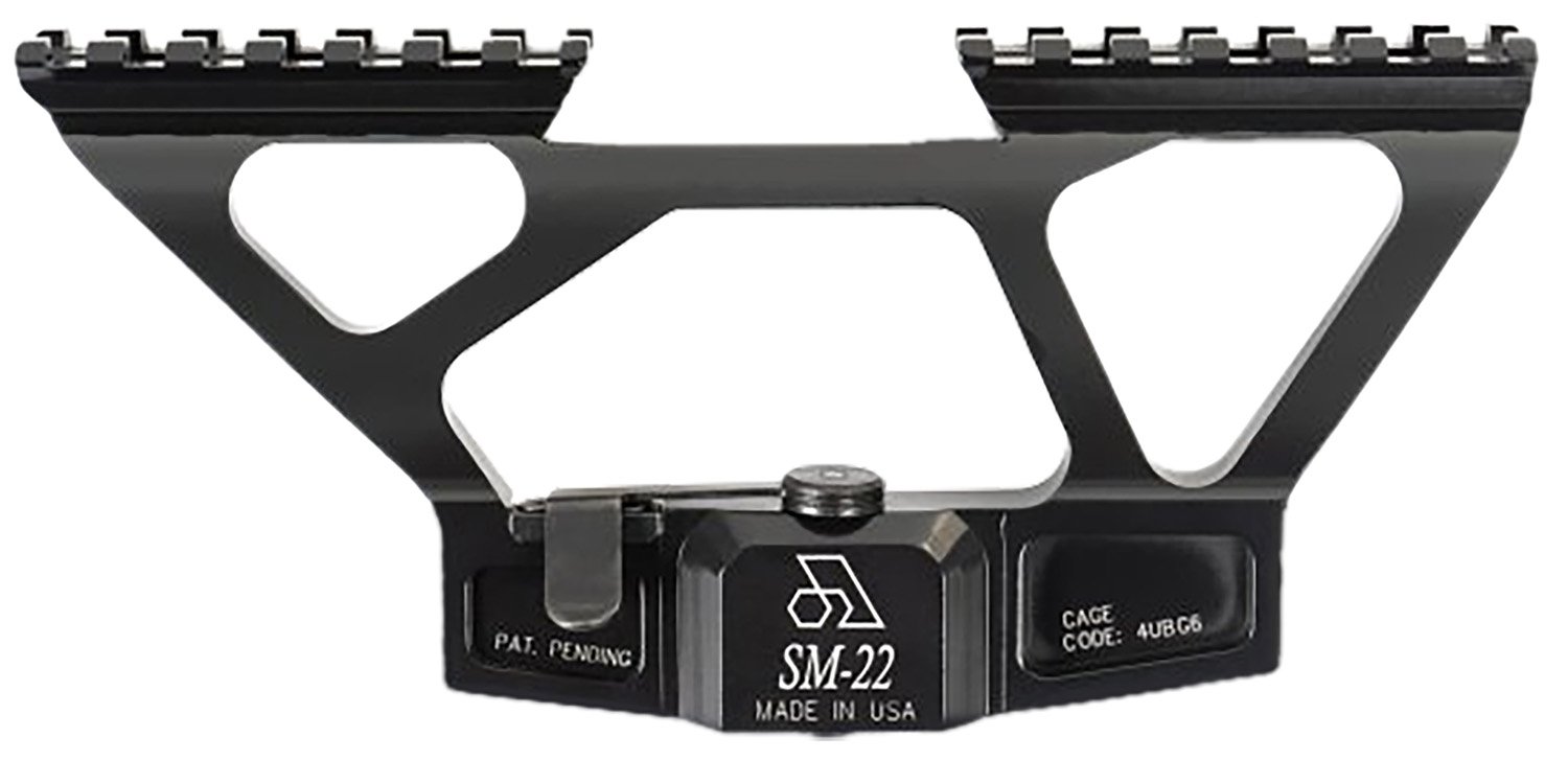 The SM-22 utilizes the time-proven steel adjustable locking mechanism (tension adjustable) that allows instantaneous attachment without any compromise to accuracy. Scope mount for SAM7K, SAM7SFK, AR-M4SF, and other Arsenal SBR with peep rear sight. 2.9 of Picatinny rail play per section, 5.8 total. Low profile, one-piece, quick release, 7 railing slots forward of rear sight and 7 railing slots behind rear sight, Arsenal, Inc USA.