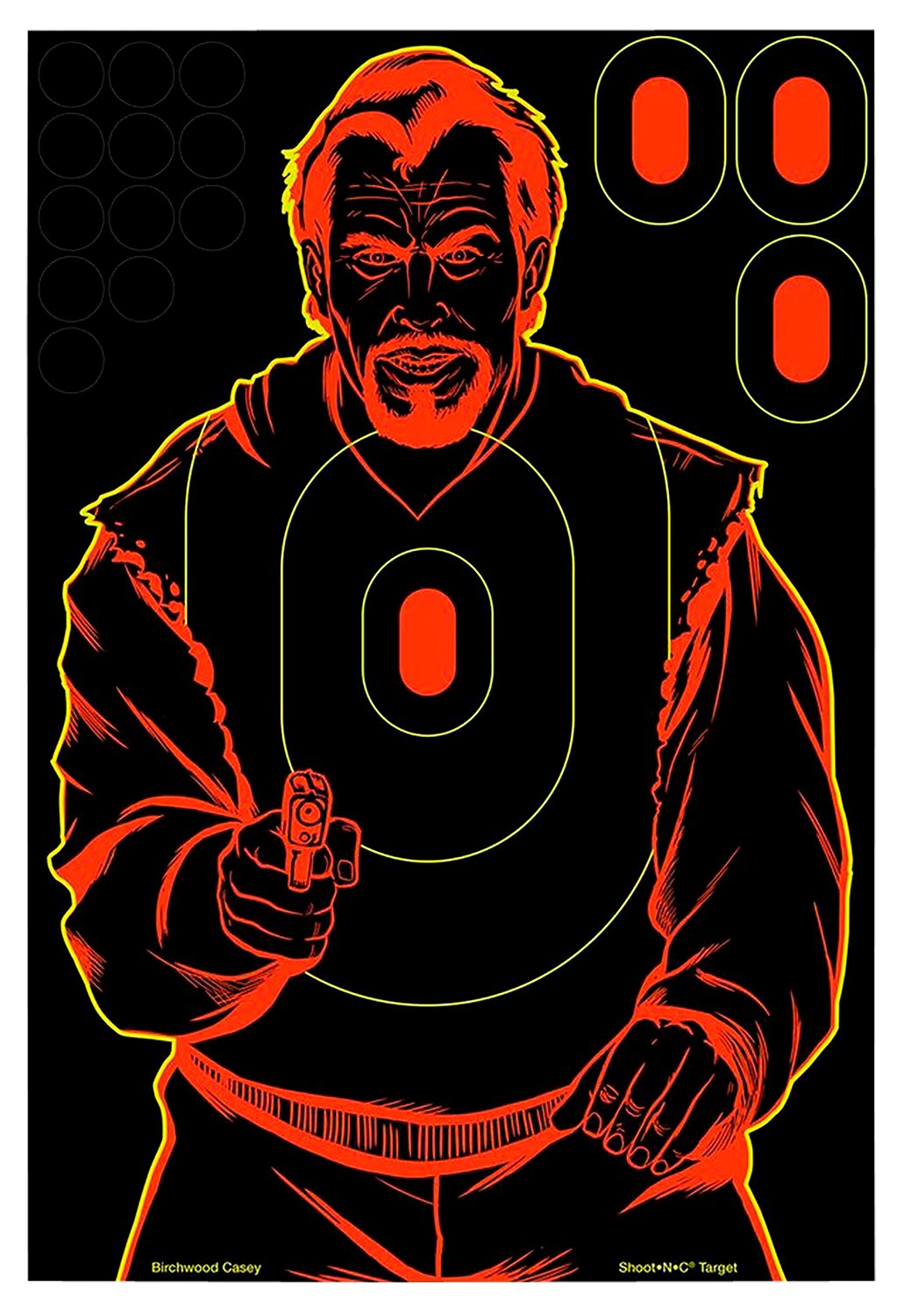 The Shoot-N-C Bad Guy is great for handgun personal defense training. Bullet holes are revealed with bright chartreuse rings.