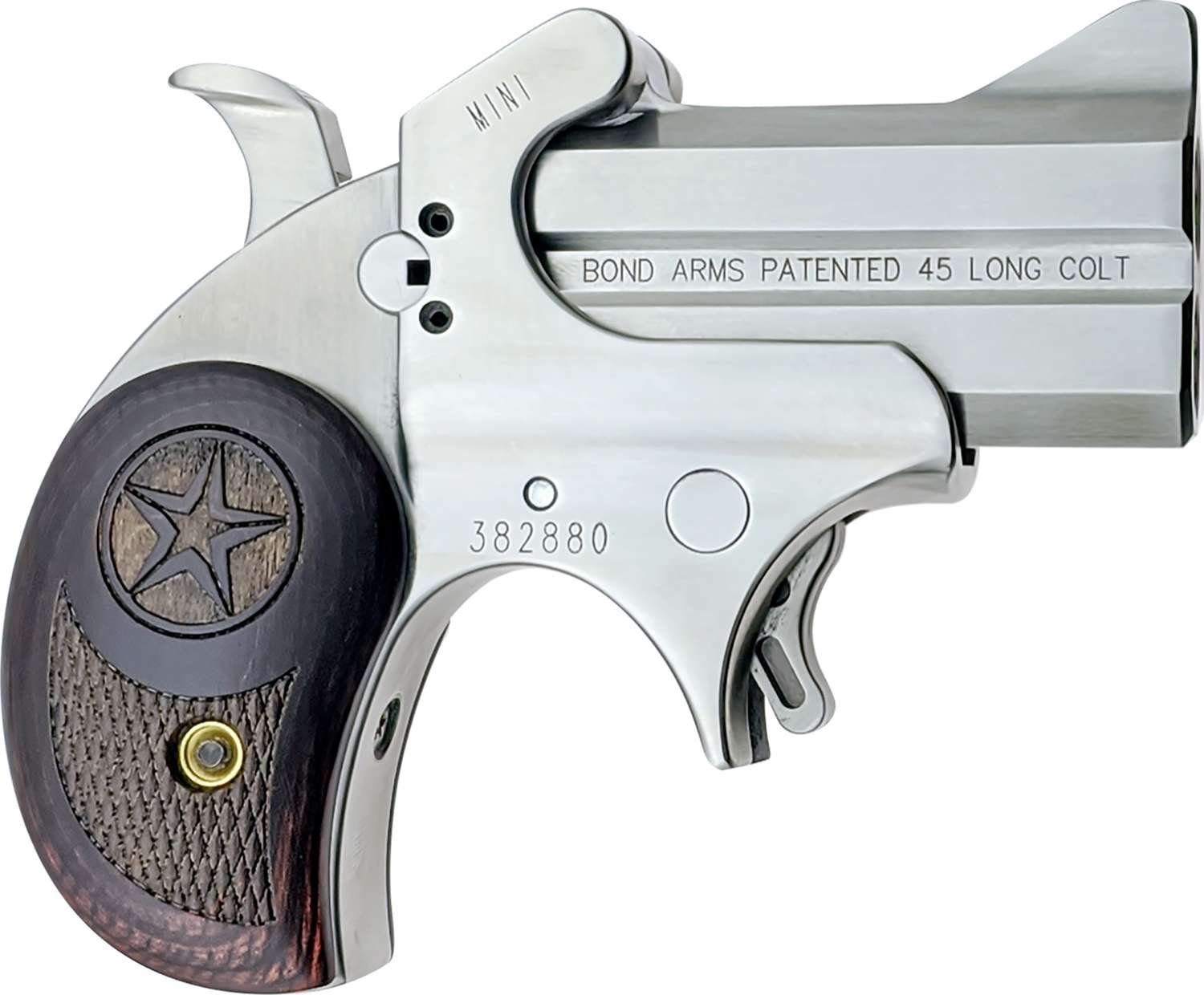 This Mini 45 revolver features Rosewood grips and front blade sight with a fixed rear sight. It comes with a stainless steel finish, automatic casing extractor, rebounding hammer, retracting firing pins, and a cross-bolt safety.