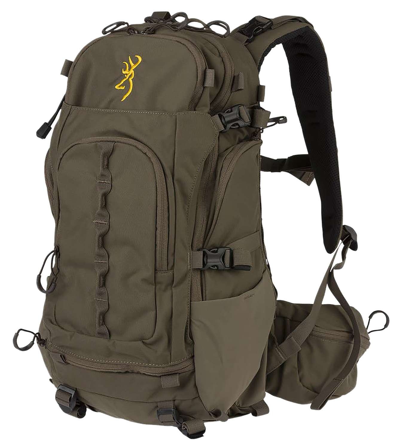 The Whitetail 1900 day pack offers the space needed to haul gear into the backcounty or for the trek into the treestand. The size easily swallows a full day’s worth of gear and has large openings for easy access. With comfort in mind, the harness system consists of adjustable, padded shoulder straps and waist belt. The padded back panel is ventilated for excellent airflow. A sternum strap helps stabilize the load. The padded waist belt provides additional support and easily accessible storage, including a removable cartridge carrier. A semi-rigid panel adds flexible structure and support. Constructed using tough, yet lightweight materials, this three compartment design features a main compartment, the secondary compartment and an exterior section on the front contains an additional compartment and pockets while also providing an area to strap extra gear or haul bulky items. Length pockets on each side are easy to reach and provide the perfect spot for larger equipment that needs to be accessed quickly without opening the main compartments. Large elastic side pockets are perfect for larger water bottles or trekking poles. The zippered pass through and included rifle or bow carrier keep your hands free when hiking or scrambling up steep slopes. Large zipper pulls throughout are easy to use with gloves. The included rain cover stores inside a pocket on the bottom.