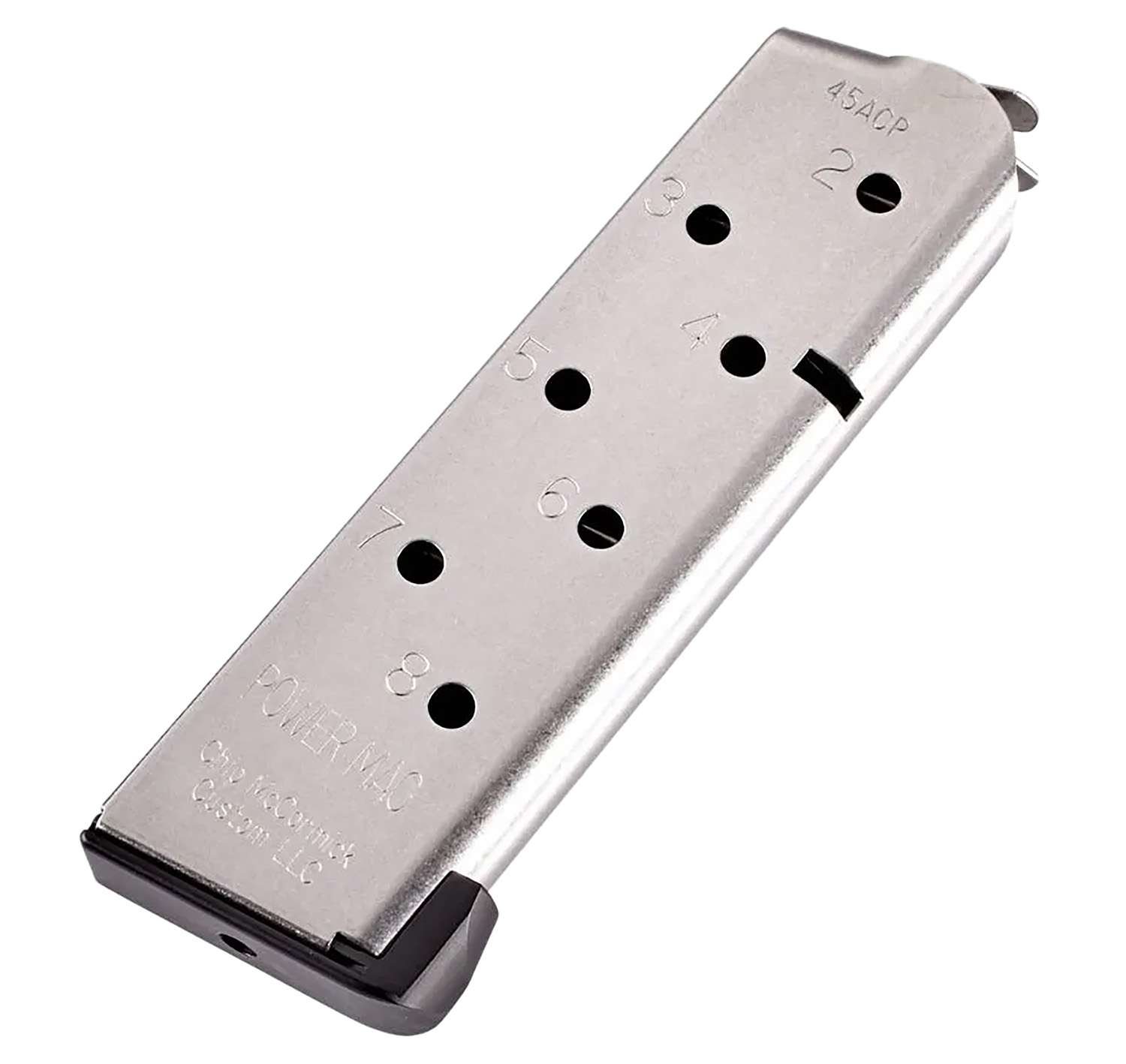 Power Mags are lean and sleek, yet they are extra-heavy-duty with increased reliability and service life. A unique all-steel follower design yields the lowest possible bearing surface for long-lasting function in dirty environments when ongoing cleaning and maintenance may not be possible. The unique follower design also functions as a spring, which allows the high tensile rocket wire spring coils to be the largest (side to side, front to back, and top to bottom) of any extra capacity .45 caliber 1911 magazine.