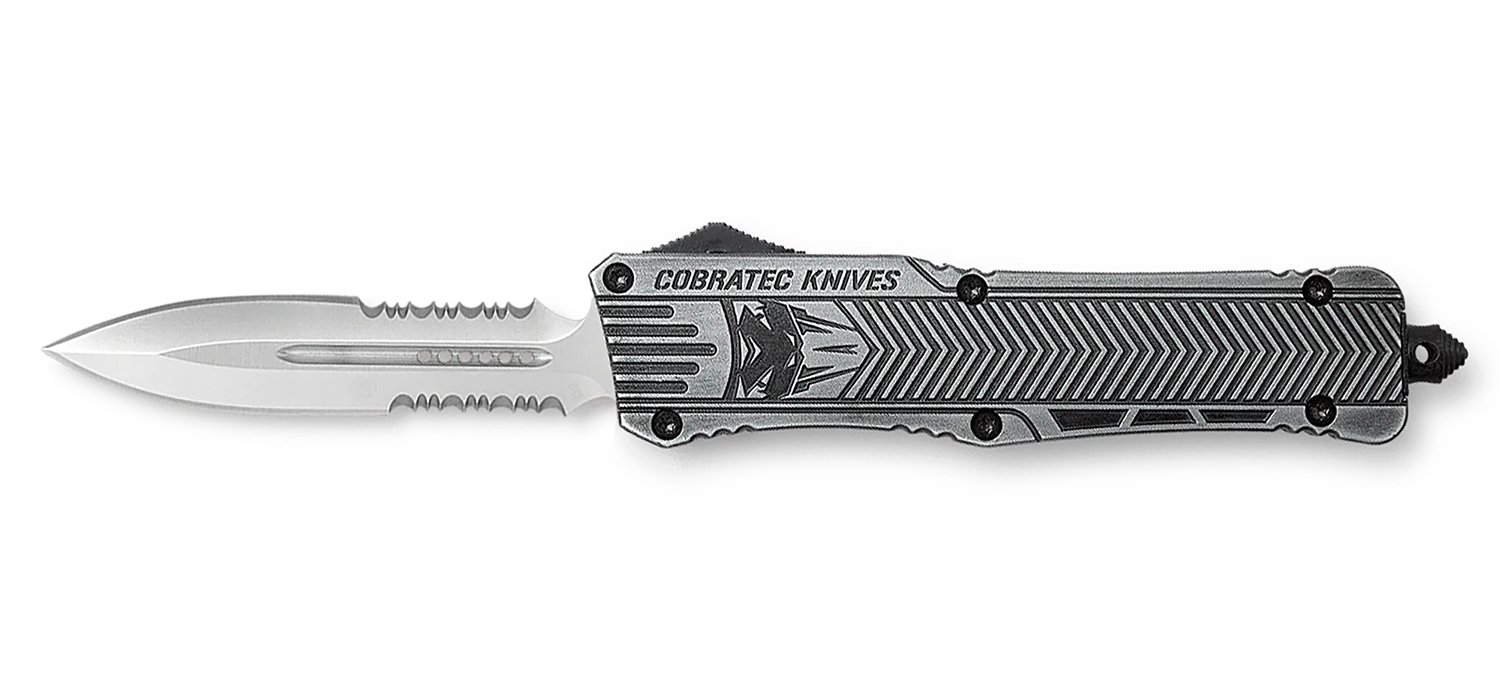 The CobraTec CTK-1 Dagger is designed for use with any task. Featuring aluminum alloy handles, D2 steel blade and OTF (out the front) opening design it allows for rapid deployment with minimal effort. The OTF knife features a pocket clip, a glass breaker for emergencies and includes a nylon sheath.