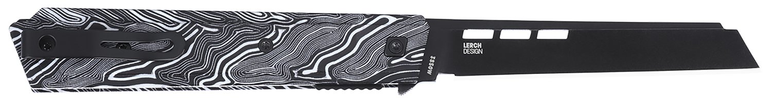 The Zephyr features a 14C28N steel blade in a titanium nitride finish; Sheepsfoot profile; marbled black and white G10 handle keeps things lightweight, durable and dependable in hand; blade is deployed with a low-profile flipper tab and is powered by the IKBS ball bearing pivot system, offering a smooth, fast action.