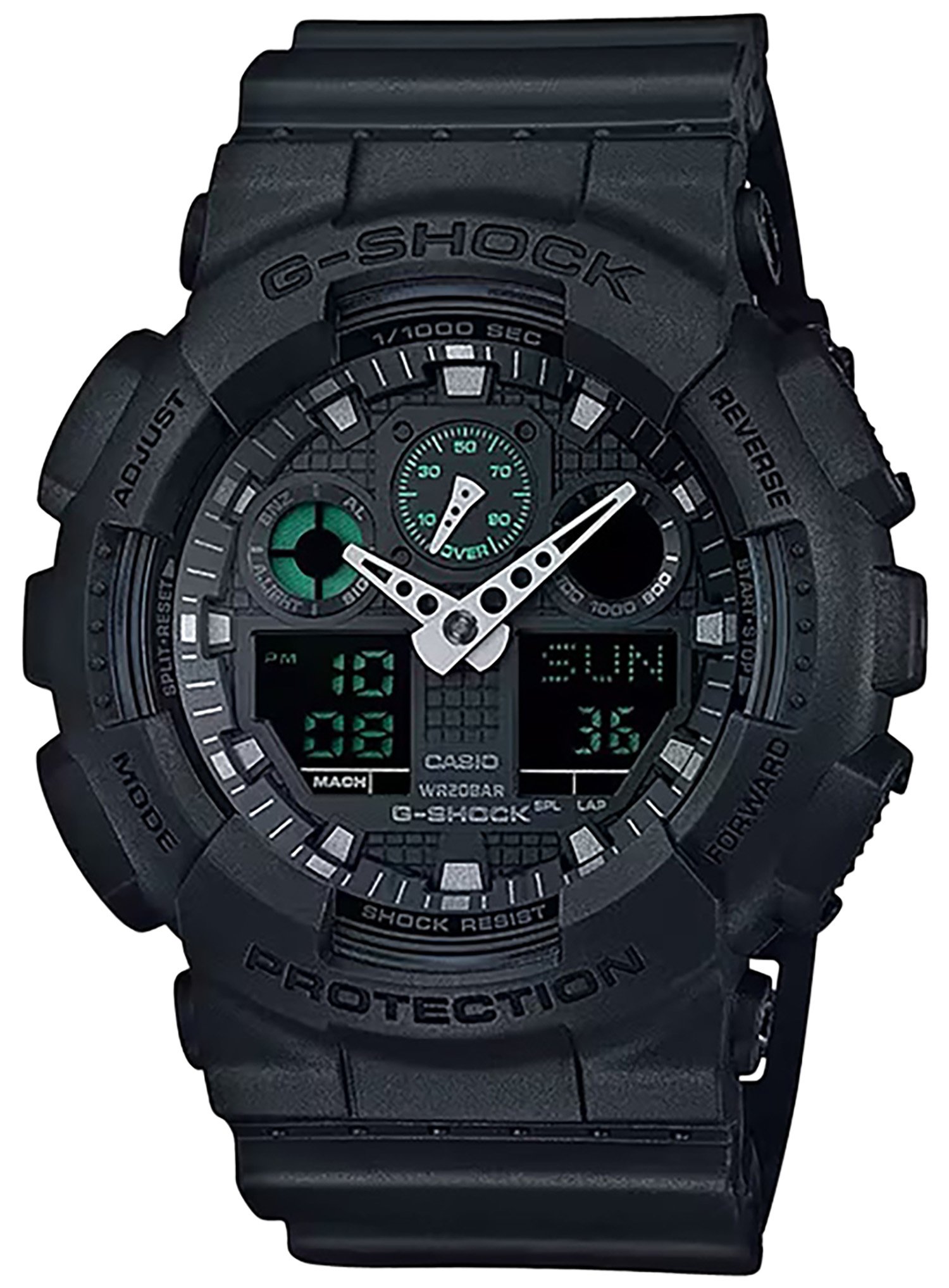 G-Shocks most popular large case analog/digital series introduces a matte black watch, the GA100MB-1A. The face and band are matte black with green accents which highlight the toughness and coolness of G-Shock.