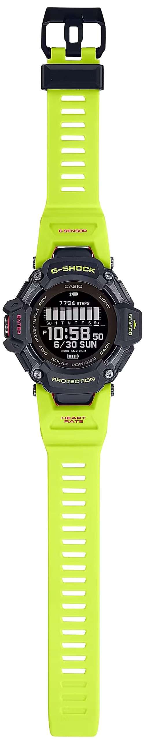 The GBD-H2000-1A9 is an advanced fitness tracker and performance monitor and comes equipped with a heart rate monitor, step counter, gyroscope that detects strokes and turns when swimming, GPS, and Bluetooth connectivity. This black and yellow smart watch features an impressive range of outdoor environmental sensors, including an altimeter-barometer, compass, and thermometer. A step up from its predecessor, the GBD-H1000, the GBD-H2000-1A9 new features include blood oxygen measurement, cardio load status, sleep measurement and analysis, sunrise and sunset time display, and moon age data. The Bio-based resin watch band is made from renewable organic materials that reduce environmental impact and facilitate the shift to a circular economy. The Smart Alarm function measures sleep state and selects the optimal time for a sound or vibration alarm. Its rechargeable lithium-ion battery can be powered by USB cable or solar power.