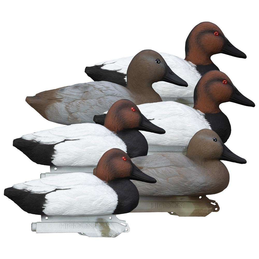 Higdon Outdoors is bringing the high visibility of the Canvasback to the standard line! These are a great addition to any spread and deliver ultimate space saving without sacrificing visibility and contrast to diver hunters. Higdon's legendary Foam filling was a must when making this line! Never worry about shooting your diver decoys again! Higdon Outdoors set the standard for foam filled waterfowl decoys and these are sure to perform season after season. Multiple extra-wide body postures and head positions add visibility and life to your setup. Standard size decoys are slightly undersized from an average live duck and are perfect for hunters looking for lightweight packable affordable decoys. Use them on their own to pack in to your favorite public spot or to add numbers and variety to any spread. Self-righting forward-weighted keel for quick and easy set-up in any water depth. Higdon's innovative keel clip allows simple short stringing in shallow water. Higdon's highly detailed proprietary UV painting process and deep realistic carving techniques highlight each individual feather and minimize unnatural glare even when decoys are wet. Our paint won't peel or fade so your decoys will look great season after season. Package includes: 2 Upright Drakes 2 Resting Drakes and 2 Resting Hens. As a Ducks Unlimited Official Licensed Product a percentage of your purchase will go toward wetland conservation.