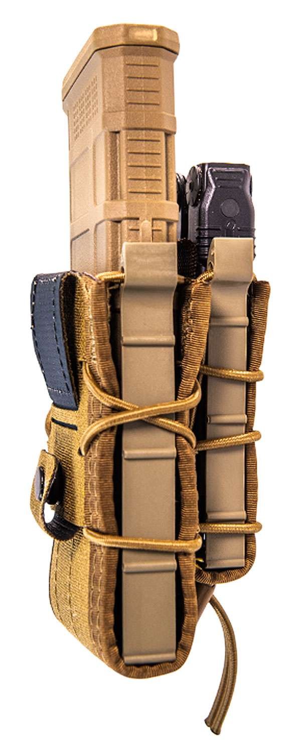 The Double Decker TACO combines the TACO and Pistol TACO into one secure unit. This unique pouch can securely hold a various combination of mags and other accessories. Both TACO pouches are made of Cordura, injection-molded polymer brackets and shock cord. High Speed Gears new Adaptable Belt Mount (ABM) attachment format offers a sturdier alternative for mounting to belts. This attachment method uses a strip of durable, vinyl-backed 1000D Cordura nylon laminate and reliable YKK snap closure to create a belt loop. Two lasercut slits enable the user to thread the loop smaller or larger for 1.5-1.75 belts or 1.75-2 belts, respectively.