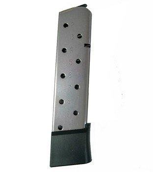 Stainless steel 10-round magazine for 1911 .45 ACP pistols with full-length grip. Offering increased capacity in a single stack this magazine does not fit flush and extends beyond the bottom of the frame. Compatability: Kimber Custom Pro Ultra+ and other models with full-length grip Colt Government and Commander models plus almost any brand and model of mil-spec 1911.