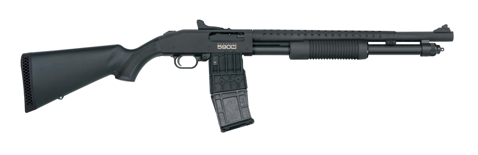 For home security, tactical and competition applications, the 590M pump-action offers many practical advantages such as faster reloading/unloading, increased capacity without additional magazine tube length and quick and easy transitioning between several types of loads. It features dual extractors, twin action bars, positive steel-to-steel lockup, drilled/tapped receiver, ambidextrous safety and a heavy-walled barrel. This model has 18.5″ heavy-walled barrel with a heat shield, Cylinder Accu-Choke, ghost ring sights and a 10-round magazine capacity.