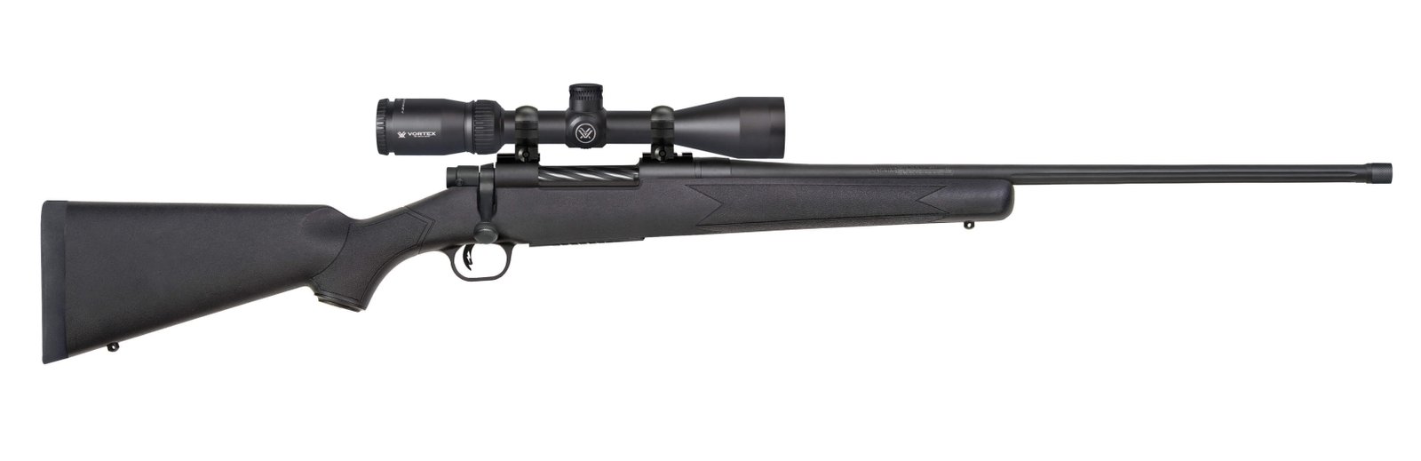 Mossberg’s Patriot Vortex Scoped Combos feature drop box magazines, recessed crowns, fluted barrels, spiral fluted bolt, streamlined bolt handle, Weaver scope bases, patented LBA user-adjustable trigger system. Crossfire II3-940 Riflescope with Dead-Hold BDC Reticle features long eye relief, a fast-focus eyepiece, fully multi-coated lenses and resettable MOA turrets. Clear, tough and bright, the hard anodized single-piece aircraft-grade aluminum tube is nitrogen purged and o-ring sealed for waterproof/fogproof performance. The Dead-Hold BDC Reticles customized hashmark design helps eliminate guesswork on holdover and windage corrections. Good at varying ranges where estimating holdover is a concern.