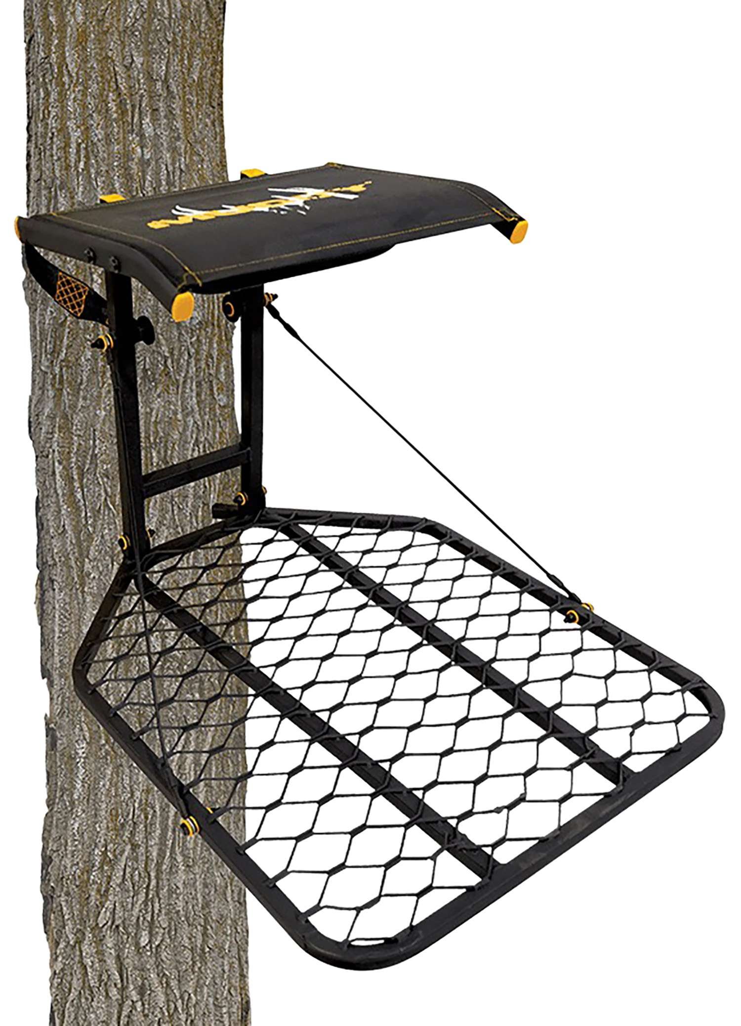 Muddy Boss Hang-On Stand features a Flex-Tek seat that flips back for full platform use and a wide stance steel platform. Uses Silent Strap System so no metal to metal contact. Foot platform is 24″ W x 30″ D. Weight rating of 300 lbs.