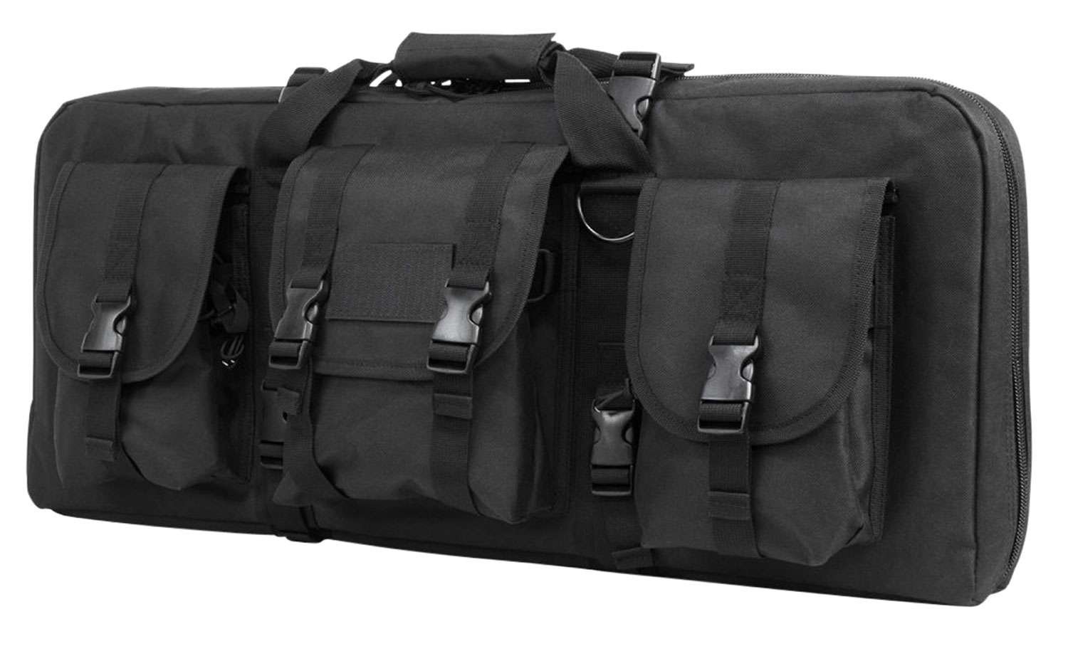 Deluxe SubGun double Pistol Carbine case allows for two AR & AK pistols, subguns, AOW or folding carbines to be transported within the padded main compartment with a padded divider to prevent weapons from contacting each other. Additional storage pouches to store mags or other gear. Each compartment has two diagonal side pocked to help secure each end of the firearm and two hook and loop straps to secure each firearm inside the case.The three large exterior pockets (2 each 7″H X 5″W and one 7″H X 7″W) to store your magazines and additional gear. Pocket flaps secure via plastic quick connect buckles, hook and loop fasteners and bungee cords help secure your gear in place. Two compression straps with plastic quick connect buckle on the top and bottom of the case to help secure your firearm and gears in place. Large Heavy Duty zippers on the main compartment with lockable metal zipper pulls. Heavy Duty padded carry handles. Adjustable shoulder strap attaches to large metal D-Rings. Case is made from heavy duty PVC material that is water and chemical resistant.