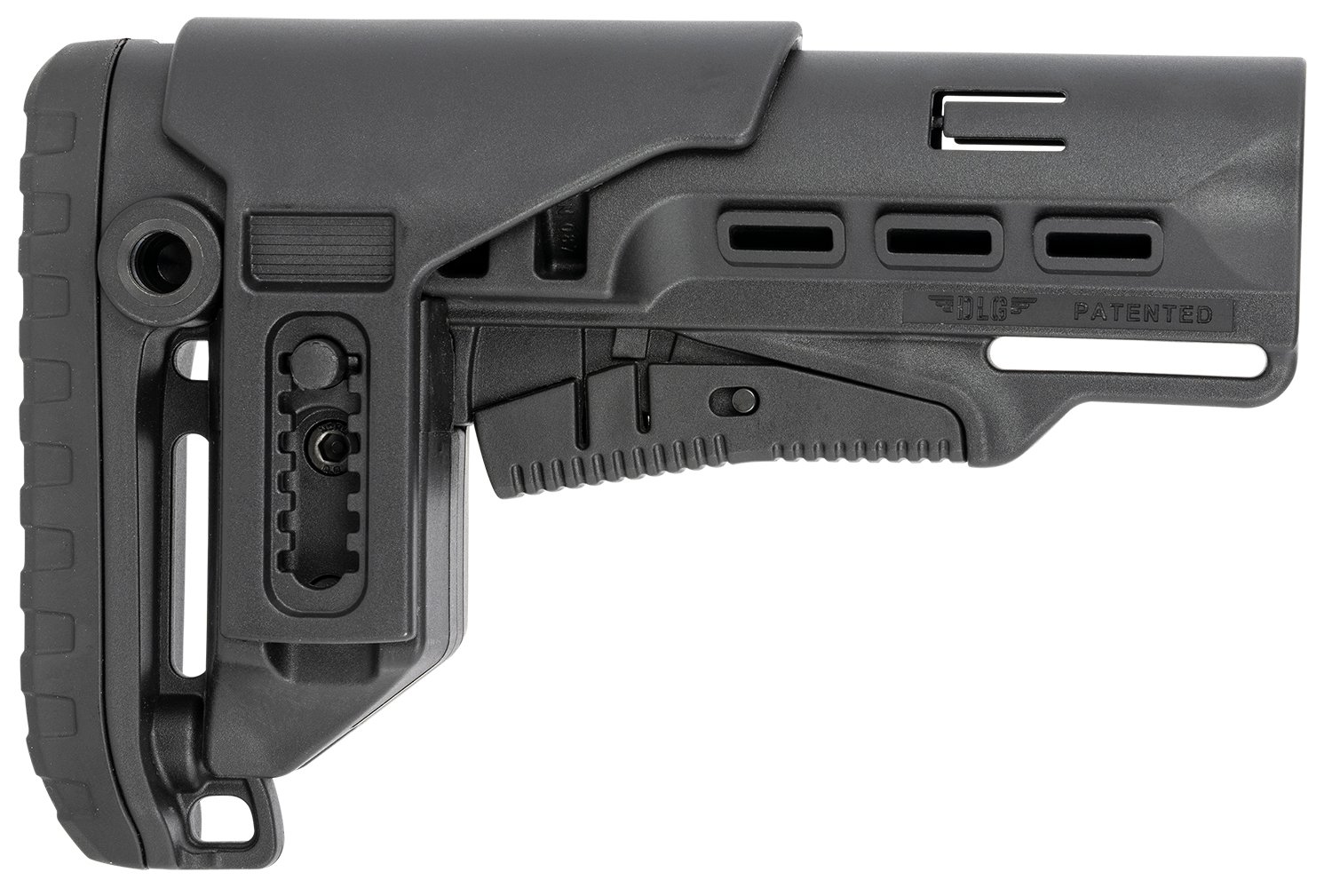 The Tactical PCP42 Mil-Spec stock is compatible with MIL-SPEC buffer tubes. It features a sleek design with metal QD base on each side for QD slings and several molded in 1.5″ sling loops. The full length 3.75″/95mm cheek piece (#052) is ideal for proper cheek positioning for mounted optics. The cheek piece is raiseable 6 positions of height, up to 1.25″/32mm of adjustment. An integrated rubber butt pad for non-slip secure shouldering, comfort, and recoil mitigation. This stock also features a unique latch mechanism, first click for adjusting stock position and a second full click for mounting/demounting from the buffer tube.