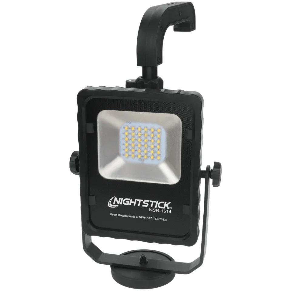 The NSR-1514 rechargeable LED area light with magnetic base is perfect when portability is important. This area light cranks out an impressive 1000 lumens of light on high and 500 lumens on low using a single sealed push button switch. The housing is constructed from lightweight 6061-T6 aluminum and the multi-fin heat sink design keeps the fixture cool to the touch.