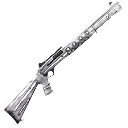 Panzer Arms M4 Tactical 12ga ARGO Piston Driven Semi Auto; Black & White US Flag Cerakote 18.5″ Barrel Standard Butt Stock; E Extended Mag Tube with Sling Attachment points; Ghost Ring Sights; Rail; 5rd