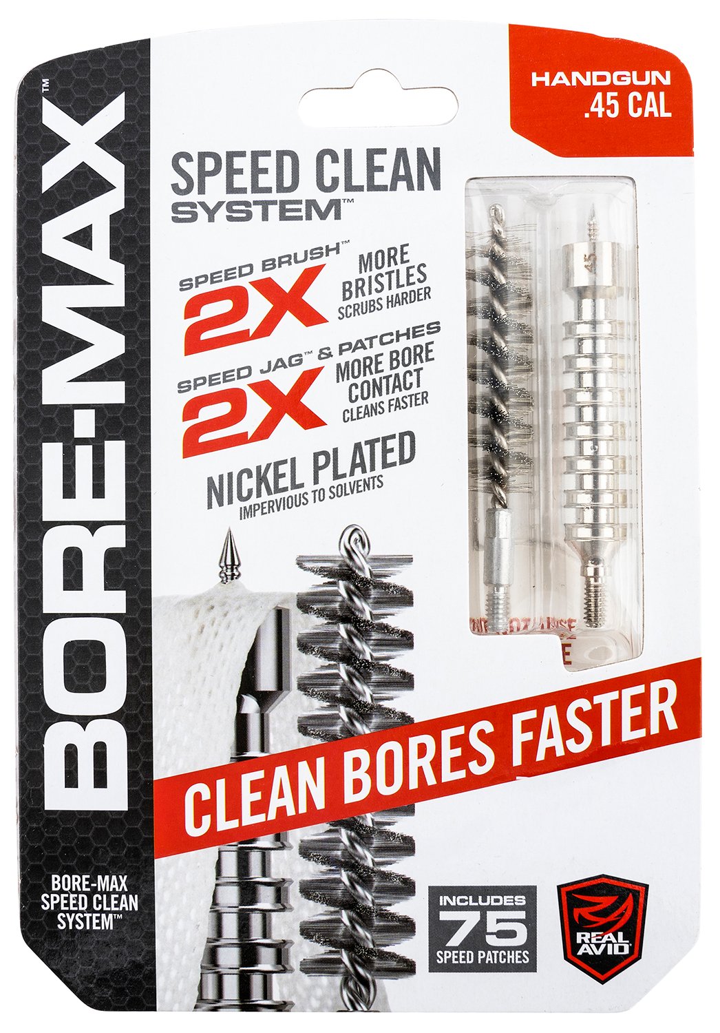 The Bore-Max Speed Clean System is precisely sized for maximum bore contact. Speed Jag and Speed Jag patches are sized exactly to work in tandem delivering precise bore fitment by caliber. The jag and brush are nickel-plated making them impervious to solvents. The pack includes 75 patches.
