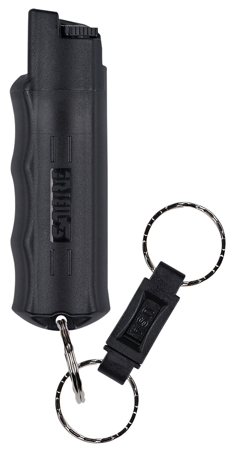 The most popular SABRE style, this Pepper Spray Keychain with Quick Release, is a small, but powerful 0.54 oz. container which deploys a ballistic stream to reduce wind blow back and contains UV Marking Dye to help police in suspect identification. It features a glow in the dark case that helps you locate your pepper spray in the dark. To charge, simply put the pepper spray under any light from 5 minutes to 2 hours to get up to 8 hours of illumination, making it a great solution to keep nearby in your bedroom so you have peace of mind while you sleep. The intuitive grip design allows for better aim and proper hand alignment with touch alone, allowing for faster deployment and helping you to keep your eyes on the threat. This police strength pepper spray provides maximum security in a powerful stream to reduce wind blowback and protect from a distance with a 10-foot (3-meter) range. Feel secure with 25 bursts for protection against multiple threats. The Quick Release with detachable key chain allows immediate access to your pepper spray and easy attachment to keychain for maximum portability.