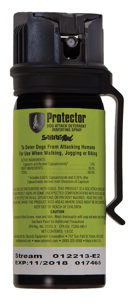 Sabre Protector is a safe, yet effective, solution to help deter dog attacks while enjoying the outdoors. It has 1% of Major Capsaicinoids – the maximum strength allowed by the EPA. Protector is strong enough to deter attacks from dogs of all sizes, without causing long-lasting injury or pain to the attacking dog. These are the two qualities consumers want most. The larger canister includes a belt clip. It sprays up to 15 feet and includes a flip top safety mechanism.