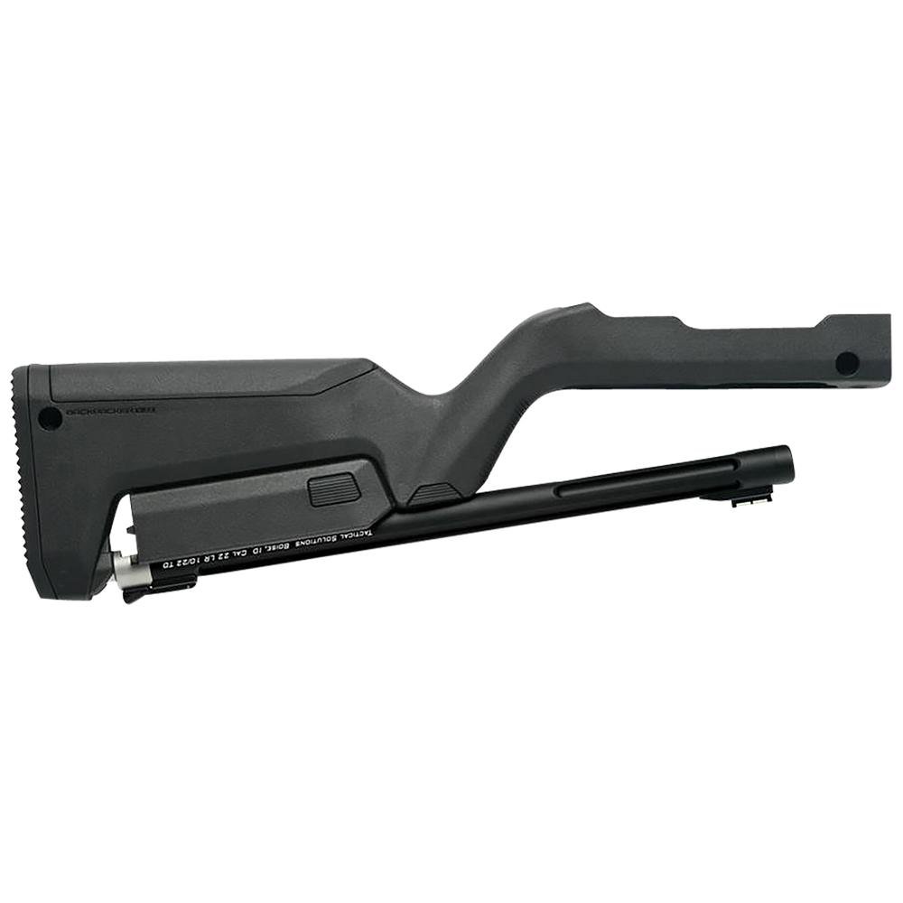 The Tactical Solutions X-RING Takedown Barrel and Stock combo is a lightweight and highly accurate .22 LR rifle barrel and Magpul X-22 Backpacker stock for the Ruger 10/22 Takedown 22LR and for the Tactical Solutions X-Ring TD VR semi-automatic .22 rifles. The innovative Magpul X-22 Backpacker stock is compact and provides the perfect lightweight platform for TacSols lightweight barrel. The X-Ring TD barrel comes standard with a fully adjustable rear sight a fiber optic front sight and a complete twist-on locking mechanism for easy installation. This barrel represents what TacSol is known for in the .22LR aftermarket barrel industry; lightweight highly accurate and easy-to-install barrels. The barrel dramatically increases accuracy performance and reliability. It is machined from 6061-T6 aluminum with a .920 diameter target contour profile. Suppressors are easily attached by simply twisting them on the barrels X 28 threaded end. Hand-chambered for 22 LR with a target crown and chromoly bore the X-RING Takedown Barrel and Magpul stock combo is everything you could ask for in a .22LR takedown upgrade.
